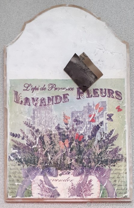 После высыхания красок я обработала поверхность наждачной бумагой, придавая ей потёртый вид, и покрыла слоем лака.