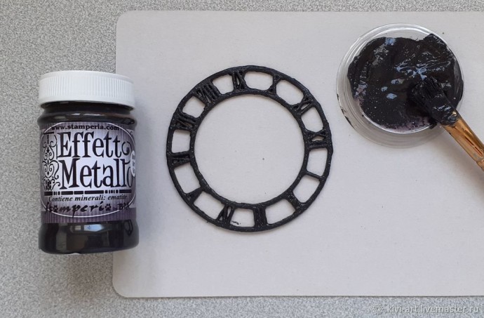А потом нанесла пасту с металлическим эффектом, которую мне пришлось немного развести водой. Иначе густая паста сделала бы цифры на циферблате совершенно не читаемыми.