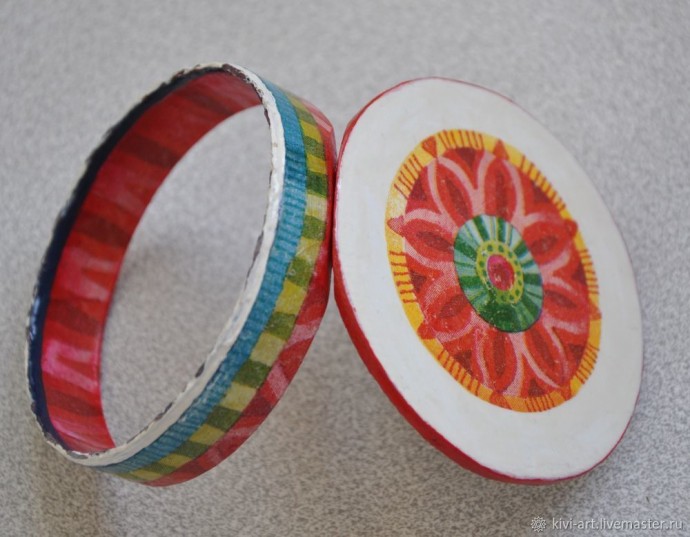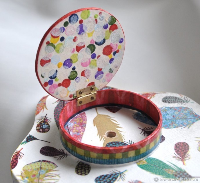 И на кольце, и на круге в месте крепления петли необходимо обязательно срезать часть картона или древесины, иначе крышка-круг не сможет открываться.