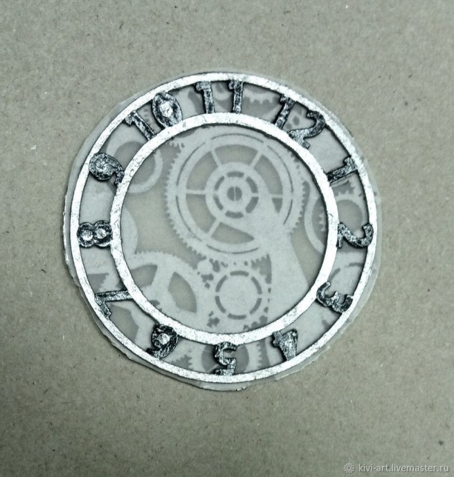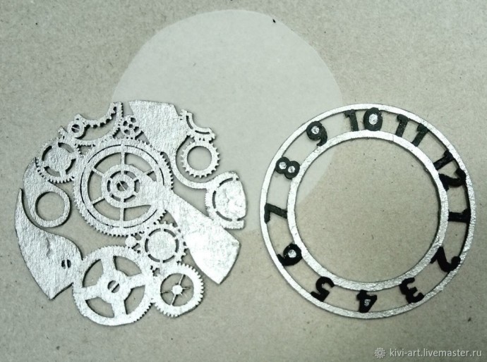 По размеру диаметра шара я приготовила 3 детали: циферблат, чипборд и круг из плотной кальки.