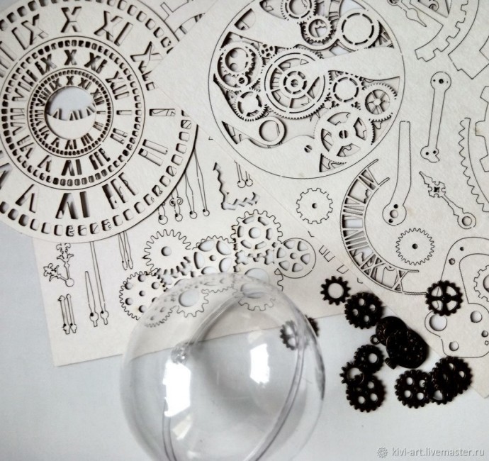 Благо, всё необходимое для этого у меня было: прозрачная пластиковая заготовка шара, чипборды с циферблатами и шестеренками, металлическая фурнитура — декоративные шестеренки.