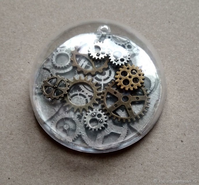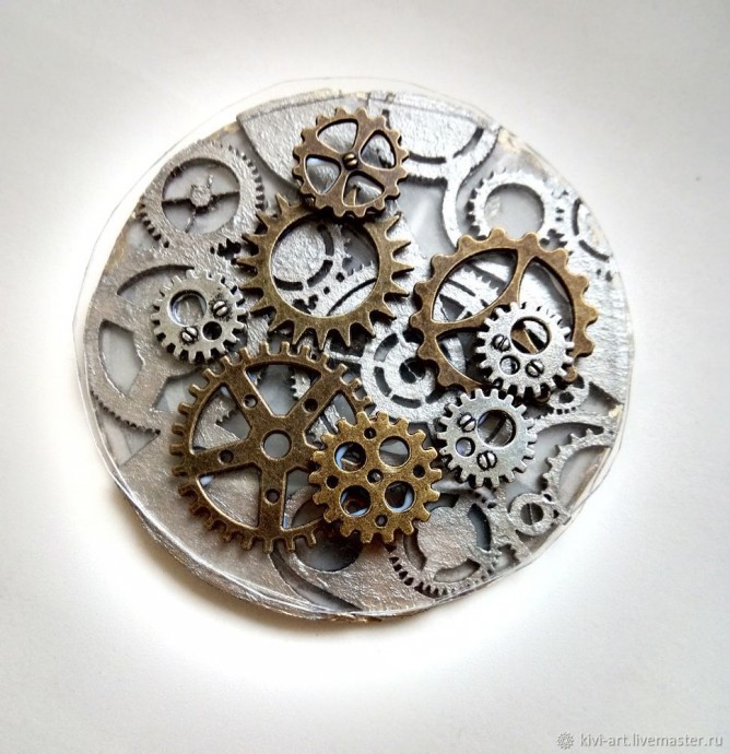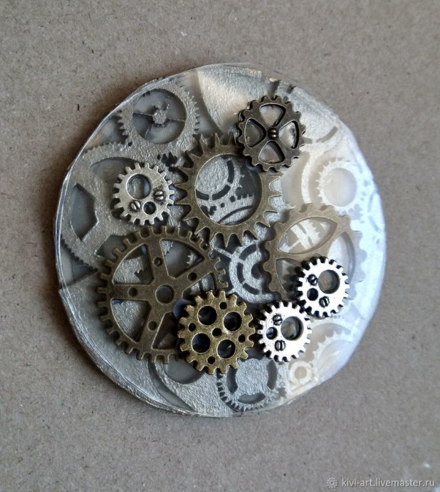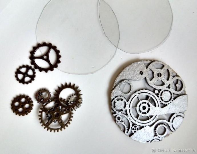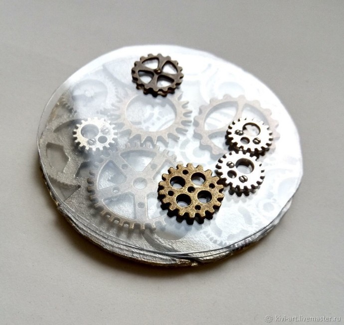 На готовый серебристый чипборд с шестеренками я наклеила сначала один прозрачный диск, а на него несколько шестеренок.