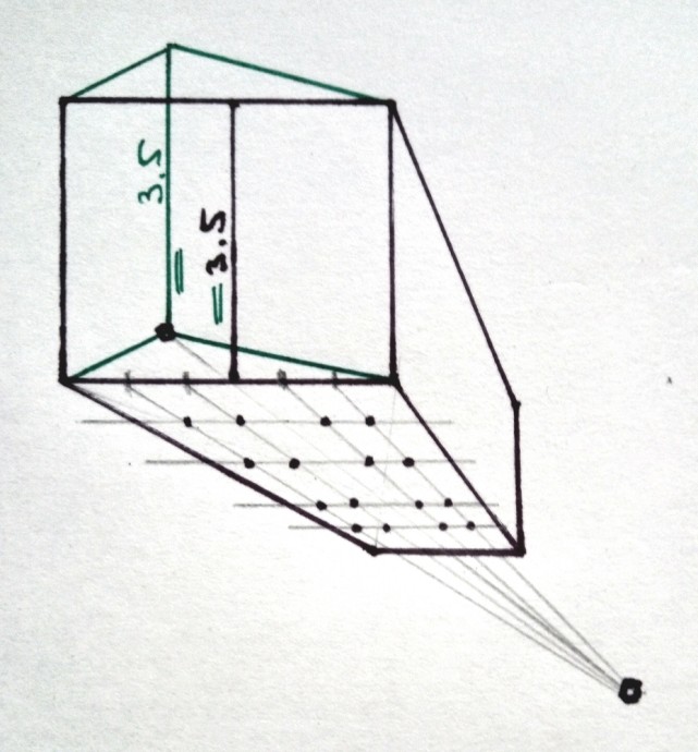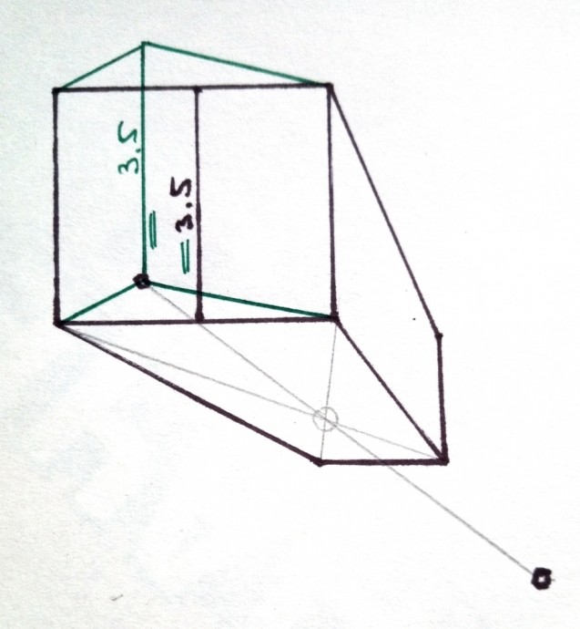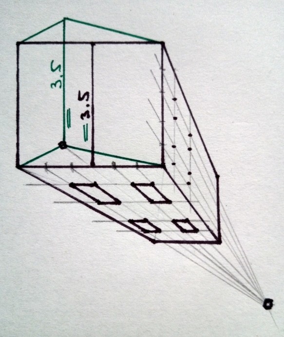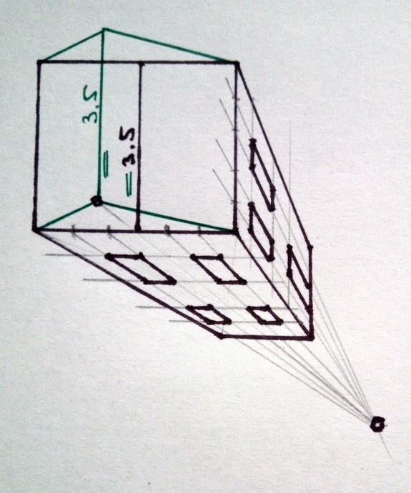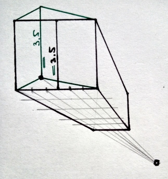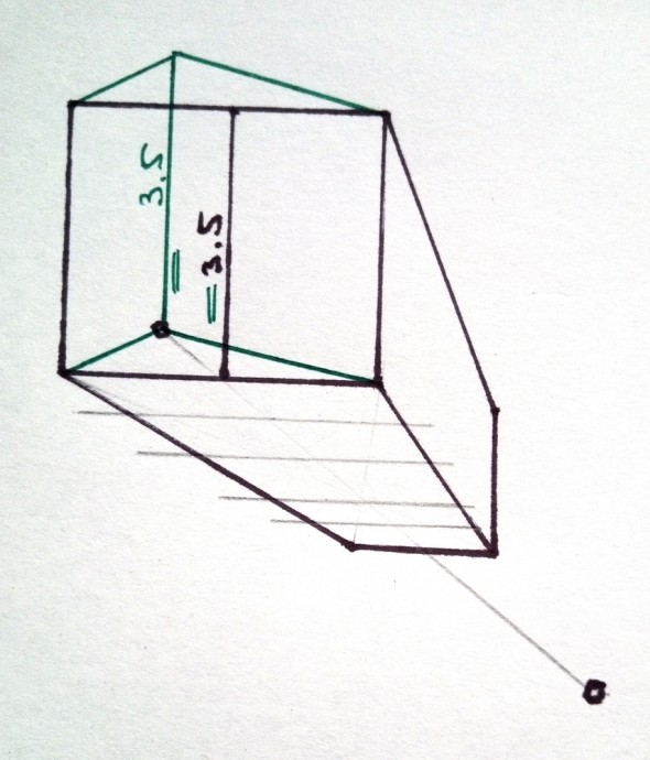 1. Если крыша двухскатная и по центру проходит конёк... а. соединяем по фасаду одну из двух крайних точек конька с ТС б. поднимаем её на произвольную высоту в. от новой точки откладываем отрезок равный длине конька и строго параллельно ему( в моём случае 3,5)- зелёные линии. г. полученную новую вторую точку конька соединяем с углами крыши — если крыша четырёхскатная... а. соединяем центральную точку( перекрёсток) с ТС.и поднимаем на произвольную высоту б. соединяем с новой центральной точкой углы крыши ПыСы... Если на длинном доме 4-х скатная крыша с коньком, то поднимаем обе точки, как в случае (б)