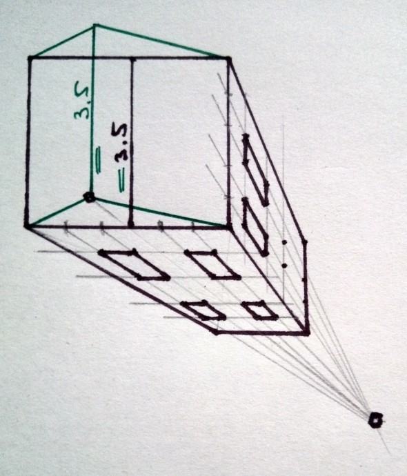 а. намечаем количество этажей( чем они ближе к земле, тем выглядят окна меньше) б. намечаем ширину окон( можно прямо на крыше поделить фасад на нужные отрезки) Все линии по фасаду ведём в ТС в. находим пересечение линий и рисуем окна г. при желании окна и двери можно сделать и на боковых фасадах — все этажи туда переносим через ребро дома.