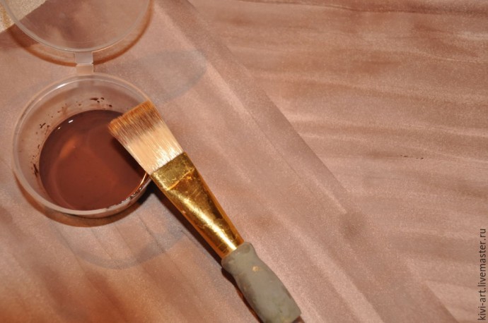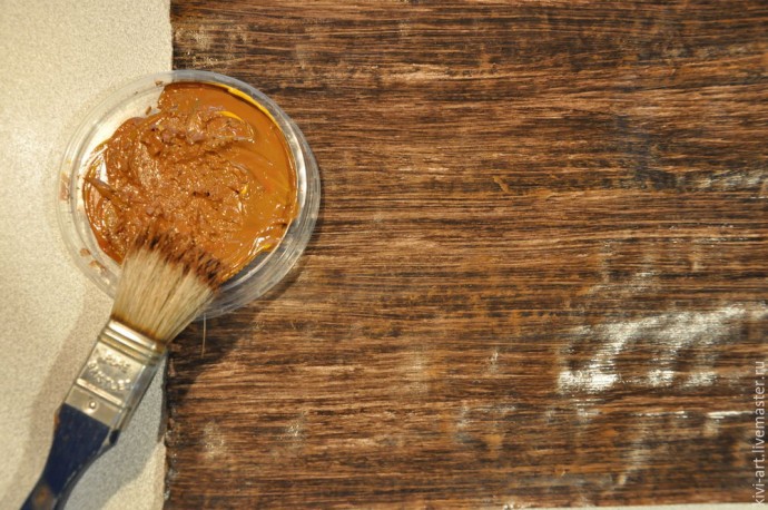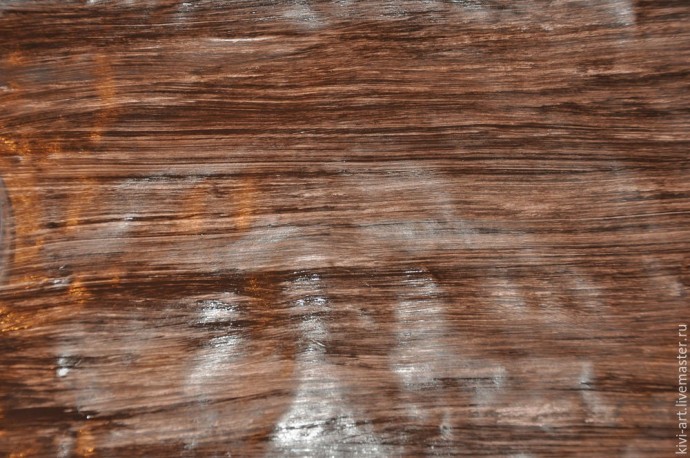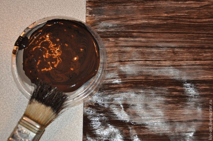 3. Просушиваем лак. Переходим к нанесению второго красочного слоя. Для этого берём СУХУЮ! кисть с жестким и редким ворсом. Это может быть старая слегка засохшая кисть или строительный недорогой флейц с растопыренными ворсинками, или веерная жесткая кисть. Окунаем кисть в более тёмный оттенок коричневого цвета (я просто добавила к краске ,которую использовала ранее, чёрную краску) — отбиваем лишнюю краску о салфетку и проводим длинные непрерывные полосы-мазки на всю длину листа бумаги так, чтобы линии, оставленные отдельными ворсинками кисти оставались хорошо заметны. И не перекрываем при этом фон полностью — он должен просвечивать под вторым слоем краски! Приветствуется нервное подрагивание руки при нанесении полос