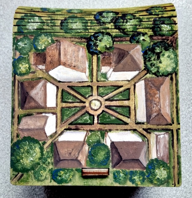 Теперь более тщательно прорабатываем фактуру крон деревьев, газонов, дорожек, фасадов, чередуя мазки разных оттенков одного цвета.