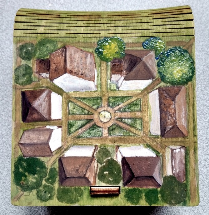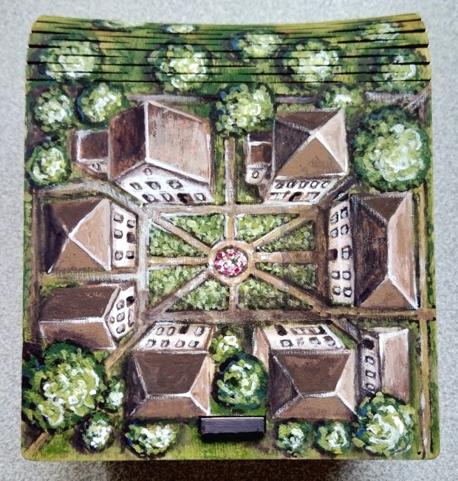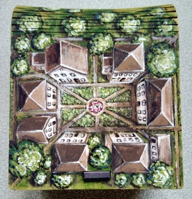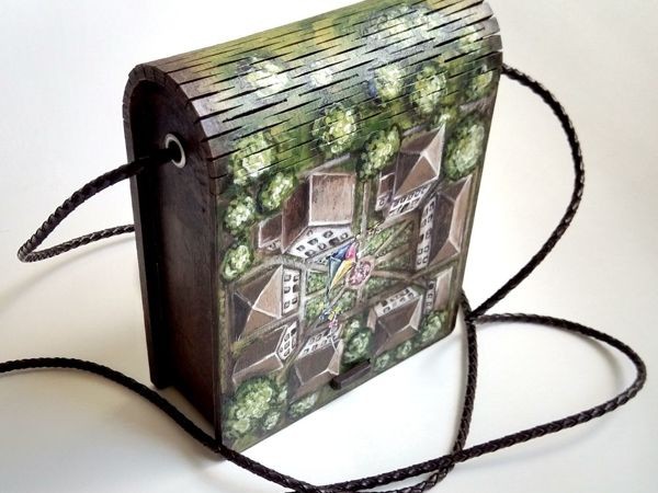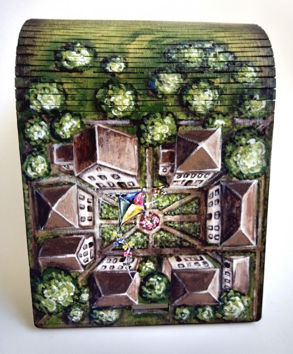 Я покрыла роспись матовым акриловым лаком и окрасила боковые и заднюю части коробочки коричневой краской разных оттенков.