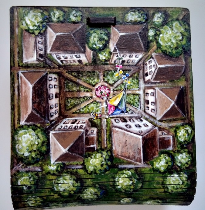 Детализируем рисунок: рисуем окна— двери (если они не сделаны на этапе вычерчивания), добавляем цветы на клумбы, делаем более заметными блики на крышах домов.