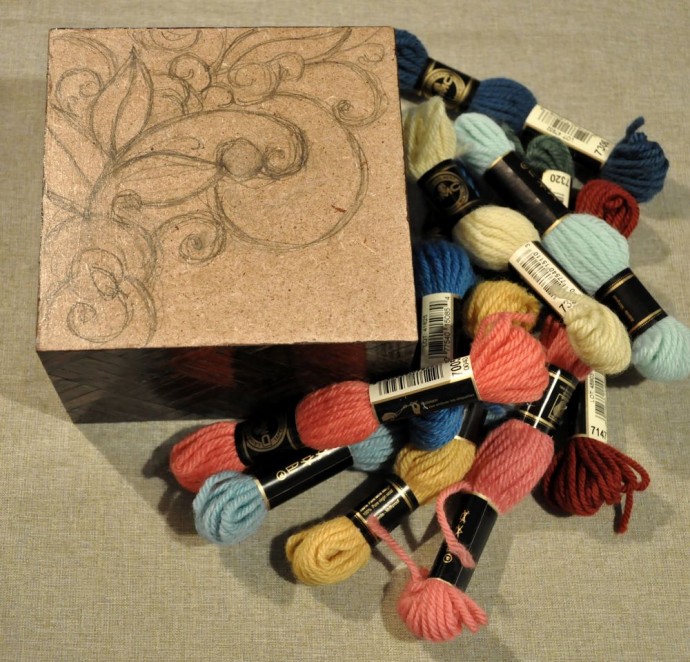 Сегодня мы декорируем крышку шкатулки — создаём орнаменты из нитей.