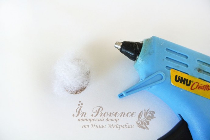 На картон с помощью горячего пистолета (или любого другого клея) приклеиваем небольшой кусочек синтепона, чтобы придать объем.