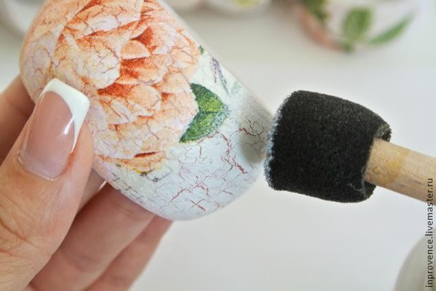 11. Внимание. Даже, если у вас образовались складочки и неровности, на данном этапе ни в коем случае не шкурим кольца! Четкие края салфеток необходимо протонировать белой акриловой краской при помощи спонжа. Спонж предварительно промакиваем на листе бумаги, для того, чтобы убрать излишки краски.