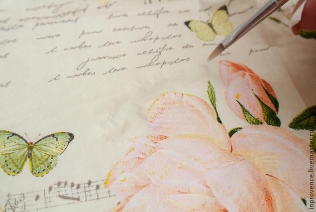 8. Выбираем необходимый фрагмент салфетки для декупажа и обводим его тонкой кистью, смоченной в воде. Это позволит нам быстро и аккуратно вырвать необходимый нам участок. Отделяем верхний слой салфетки.