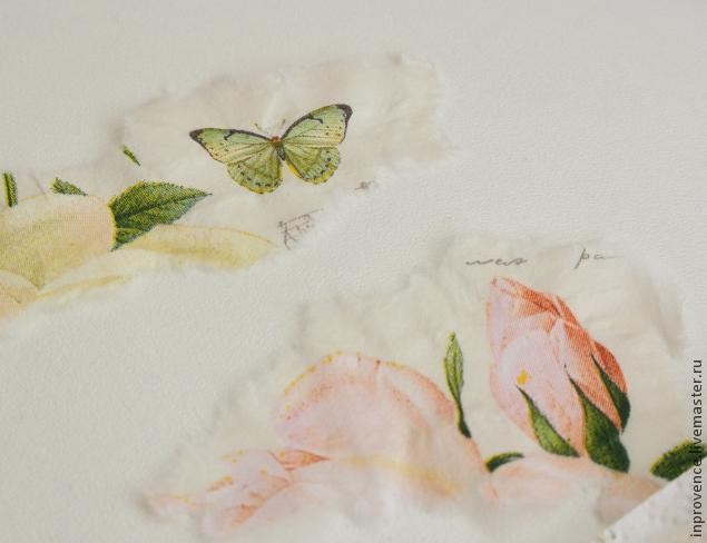 9. При помощи клея для декупажа приклеиваем фрагмент салфетки плоской кистью.Стараемся избежать образования складок, работаем,как обычно, от центра к краям. Лишние края салфеток так и оставляем до полного высыхания.