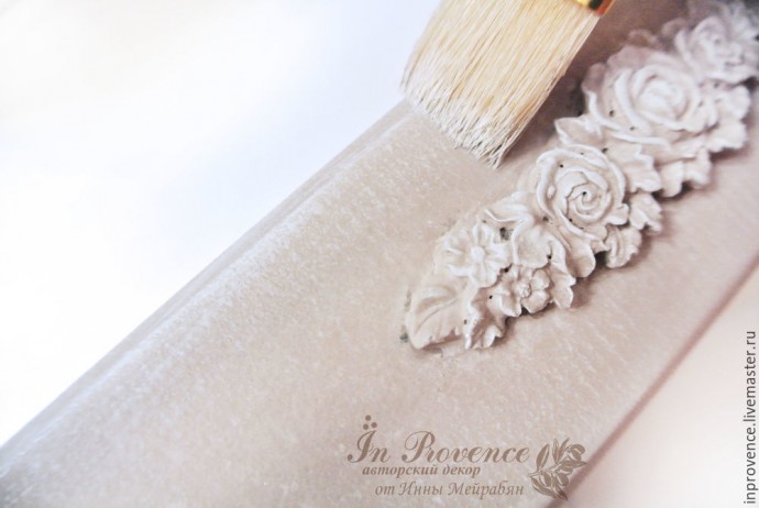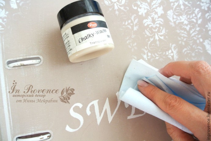 Покрываем поверхность воском. Я использую для этого мягкую безворсовую ткань и наношу воск небольшим количеством, как бы втирая его в поверхность. Можно заменить воск на матовый лак. Это нужно, чтобы защитить краску от внешних воздействий.