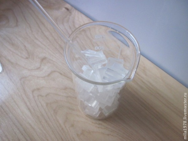 1. Растопим 40 гр. прозрачной основы, предварительно нарезанной, (желательно на одинаковые кубики размером с фундук) в чашке или миске, а на худой конец в стеклянной банке.