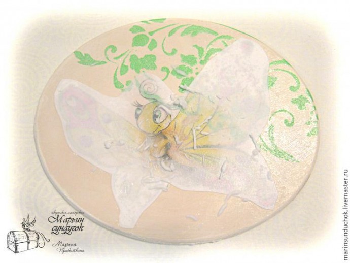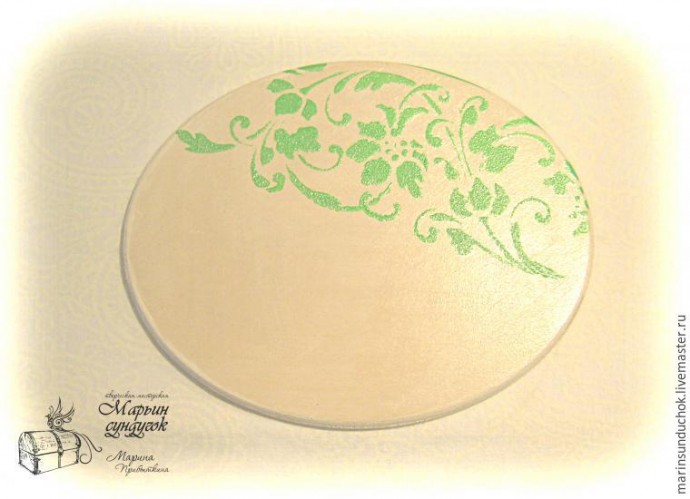 Приступаем к декорированию верхнего, меньшего по размеру овалу. На загрунтованную, просушенную и ошкуренную поверхность прикладываем трафарет со сдвигом вправо.