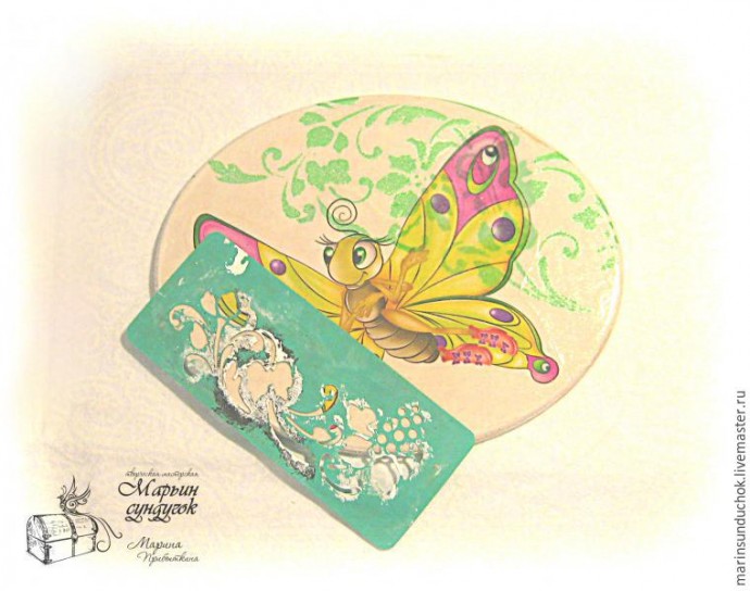 Переносим изображение бабочки с помощью фототрансерного средства Hobby Line FOTO TRANSFER POTCH Наносим слой на лицевую часть изображения и на намеченную основу под картинку. Делайте это быстро, средство не должно засохнуть!