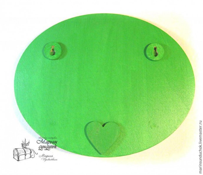 Обратную сторону окрашиваем, покрываем лаком, приклеиваем накладки с ответстиями для подвешивания и сердечко.