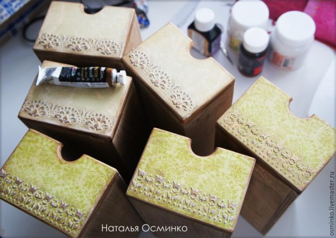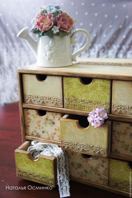 Вот все ящички. Я нанесла разные рисунки на разные цвета ящиков. Ящики с цветочками оставила без объемного декора