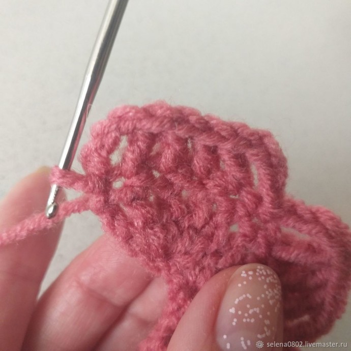 12. Последний раппорт вяжем следующим образом: 3 воздушных петли для подъёма, 3 столбика с одним накидом в вершины столбиков предыдущего ряда, четвёртый столбик с одним накидом провязываем в четвёртую петлю цепочки для подъёма второго ряда, вяжем 3 воздушных петли для того, чтобы закончить фестон. Опускаемся и делаем прикреп опять же к четвёртой петле цепочки для подъёма второго ряда.
