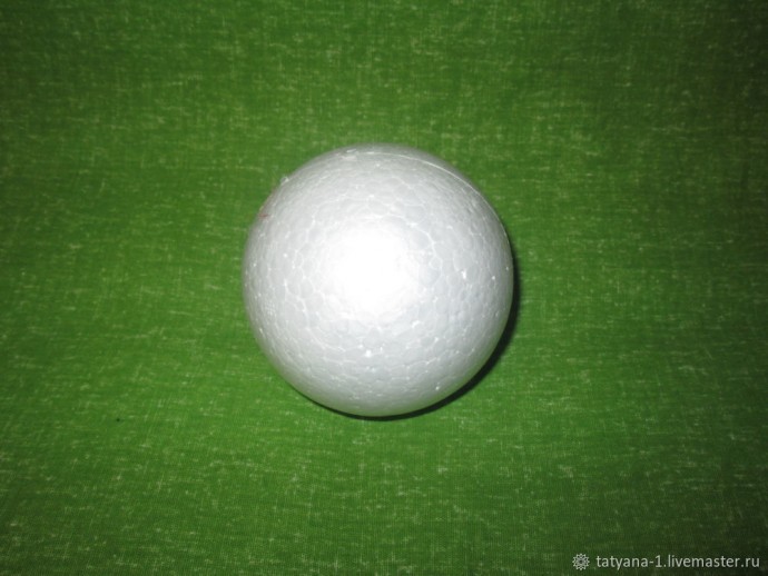 1. Для изготовления такой вишенки понадобится ровный шар. Это может быть пенопластовый, пластиковый или любой другой материал, главное, чтобы он имел ровную шарообразную форму. В моем случае это заготовка в виде шара из пенопласта.
