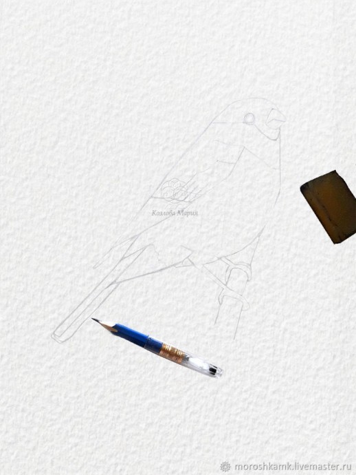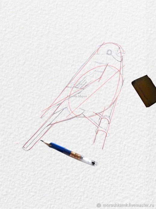 Закончив построение птицы можно стереть оси построения. Проведите формопластом по всему рисунку . Тон карандаша станет светлее. Теперь можно перейти к рисованию красками.