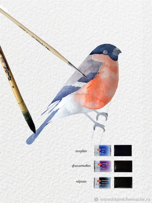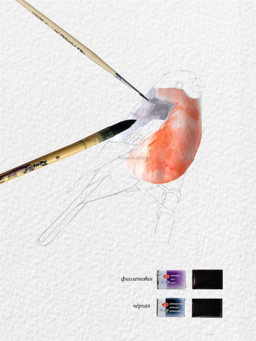 Рисуем голову и темную часть крыла. Добавляем к черной и фиолетовой краскам голубую. Из этих трех красок получаем одну и закрашиваем голову и часть крыла. Используем кисть №2 и №6.