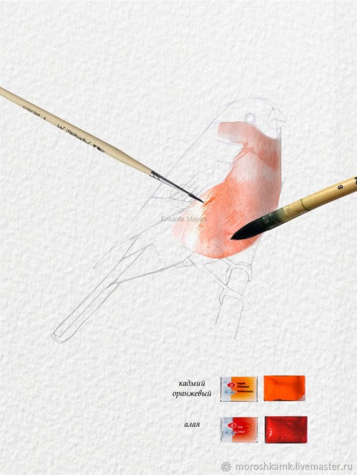 Возьмите большую кисть (кисть №6) . Окуните кисть в чистую воду и намочите рисунок там, где туловище птицы будет красным. Для создания основного тона рисуем по мокрой бумаге, использую алую и оранжевую карски.