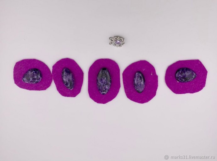 Приклеиваем клей моментом кабошоны на кусочки фетра, каждый отдельно. Края фетра слегка закруглить, для удобства в дальнейшей работе (так нить не будет цепляться за уголки фетра). И дать подсохнуть.