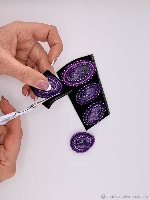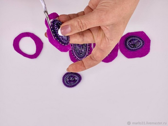 При этом ножницы нужно ставить под 45 градусов, чтоб не повредить нить пришитого бисера и не было излишек фетра по краю кабошона.