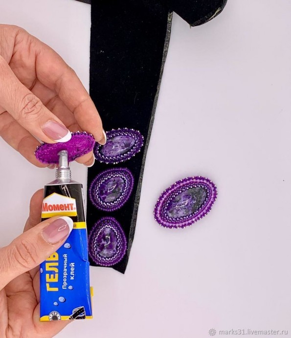 4. Теперь вновь приклеиваем обшитые кабошоны бисером к натуральной коже и даем хорошо высохнуть клею.