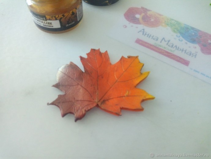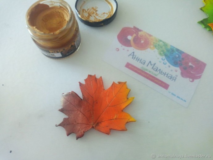 8. После проработки прожилок, я покрываю листик патиной золотого оттенка, она дает благородный блеск золота и подчеркивает натуральность.