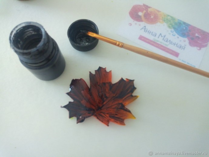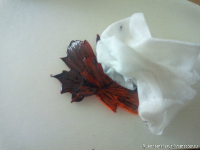7. Ну а теперь время магии. Остывший запеченный листик затираем черной акриловый краской полностью. Подождать нужно совсем чуть чуть, чтобы краска «схватилась». После покрытия краской — стираем ее салфеткой. Краска «войдет» в прожилки и там, и останется, а с ровной поверхности листика сотрется