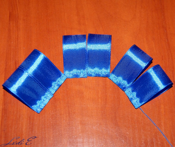 Берем 6 отрезов ленты шириной 5 см, складываем пополам и собираем на нитку (ниточка двойная на конце узелок).