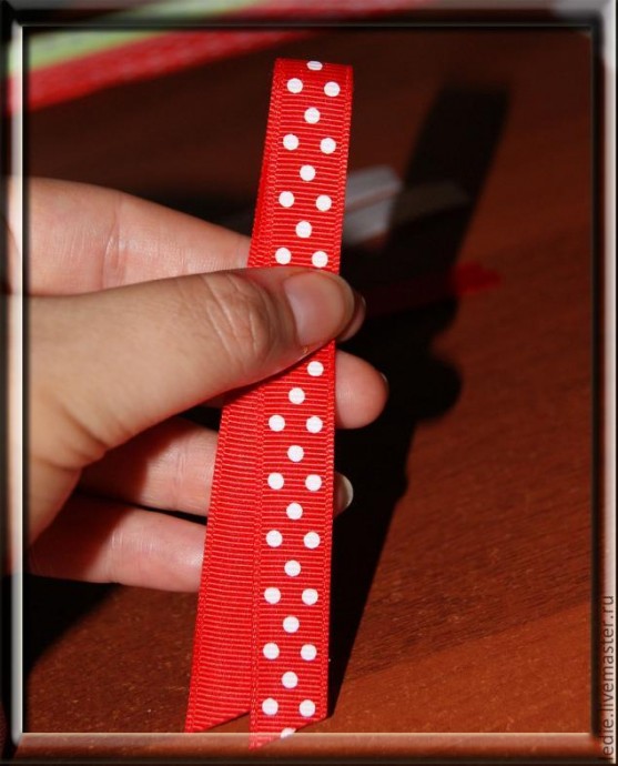 Ленточки скалываем так, чтобы получились "ушки" и берем сразу ленточку 6 мм и тоже отмечаем середину.
