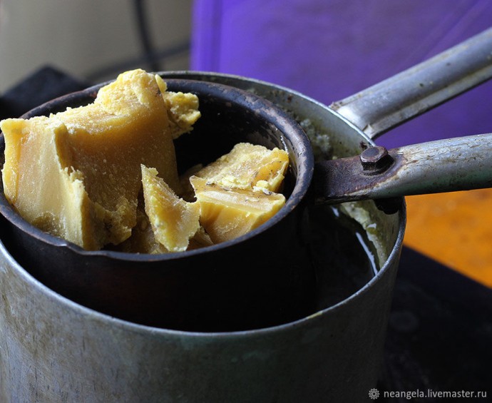 Итак, раскрошили горячим ножом воск, заложили в мисочку, мисочку поставили в кастрюльку, топим воск. Растопился, стал жидким. Добавили стеариновую кислоту. Кто-то мешает стеарин и воск в пропорции 50х50, у меня стеарина было мало, я добавляла третью часть стеарина в двум частям воска. Стеарин быстро топится, смешивается и размешивается с воском и, насколько заметила, делает воск чуточку светлее.