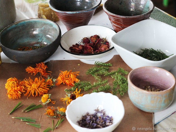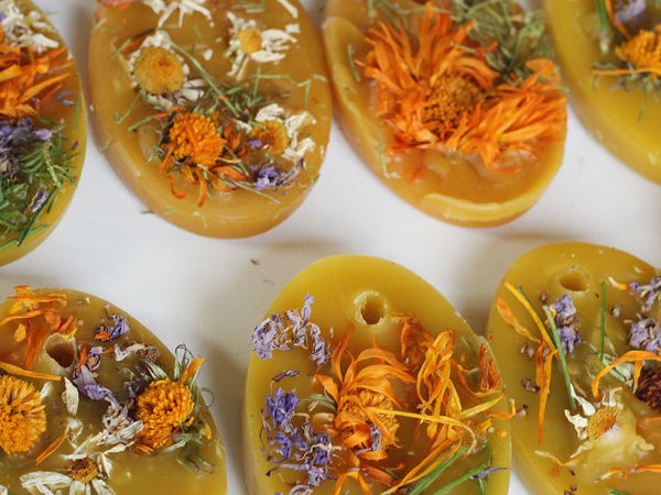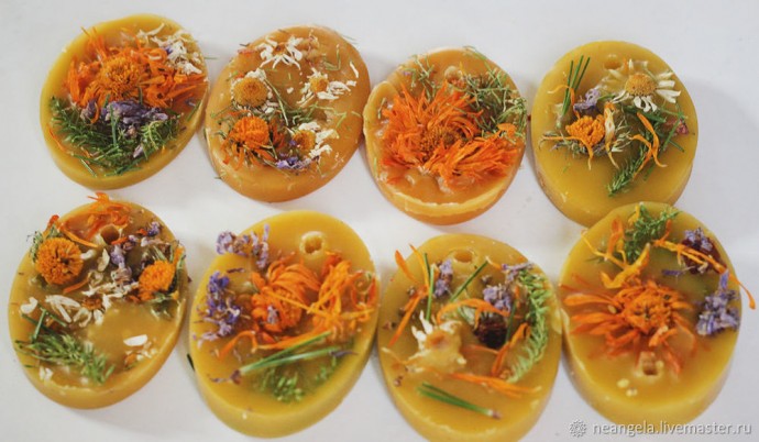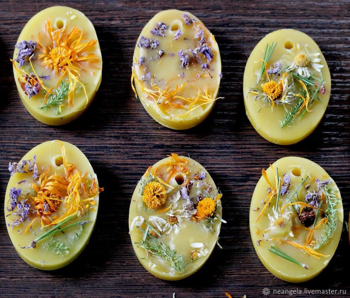 Заранее собираем палитру сухоцветов, раскладываем элементы по тарелочкам, блюдечкам и другим емкостям, из которых можно легко и быстро вынуть цветочек или звездочку и окунуть ее в застывающий воск. Я очень увлеклась, пока собирала сухоцветы по избе. Я же травник, и в воск попала вся летняя красота наших лугов, тайги и дикого огорода. Получилось примерно так.