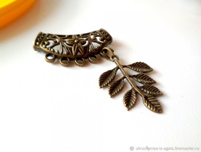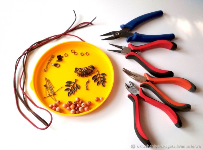 Нам потребуются оранжевые бусины 6 и 8 мм (всего 18 штук), основа для кулона, маленький отрезок цепочки (3 см), концевики, подвески листья, колечки (лучше двойные), пины, застёжка и инструменты.