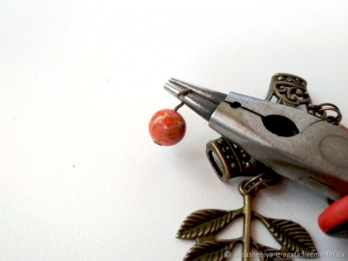 Цепочка делит кулон на 2 части, поэтому для равномерного расположения ягод по основе прикрепляем бусины поочередно справа и слева.