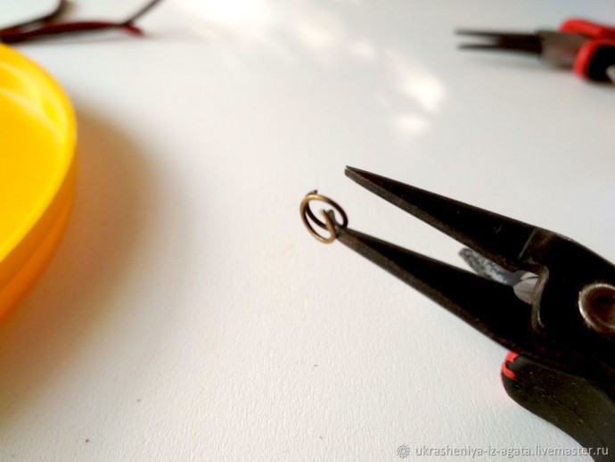 Начнём с заготовки для кулона. На основе пять колечек, на крайних будут листья, а в центре — цепочка. Для раскрытия колечек используем специальный инструмент. Он позволит легко и просто прикрепить к основе нужные элементы. Можно, конечно, пользоваться тонкими мягкими колечками, но тогда изделие не будет прочным.