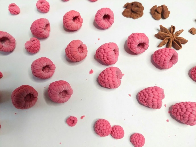 Глину желтую, малиновою и белую, смешать примерно в равных количествах, так чтобы получился розово-красный цвет. Соотношения и пропорции зависят от вашего видения. Мягкий и теплый пластик укладываем в молд, приминаем булькой. Чтобы ягодки легко доставались из молда их нужно поместить в холодильник (морозильную камеру), на несколько часов.