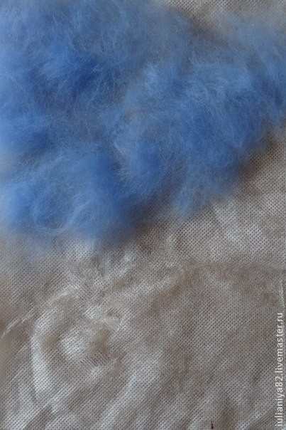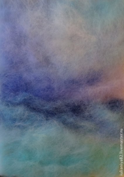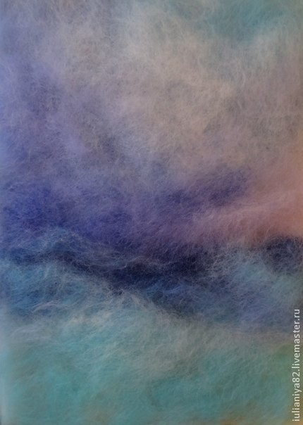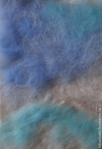 Опсание метода щипания: обкрутив прядь шерсти вокруг пальца, выщипываем с торца шерсть, собирая шерстинки в нежное облачко. Эти "облачки" выкладываем на картину. Этот метод раскладки даёт равномерный фон, гладь. Этим методом удобно делать растушевку, туманность и т.д.