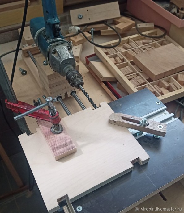Просверлите сквозные отверстия диаметром 9 мм по центру пазов в основании пресса. Это, пожалуй, одна из наиболее сложных и ответственных операций. У себя в мастерской я использую приспособление для сверления горизонтальных отверстий — на фотографии. Но можно воспользоваться и стойкой с дрелью.