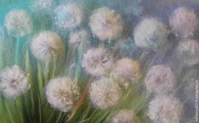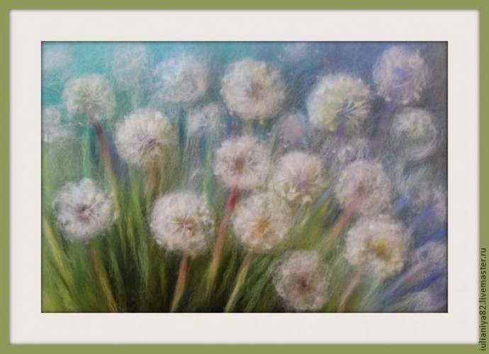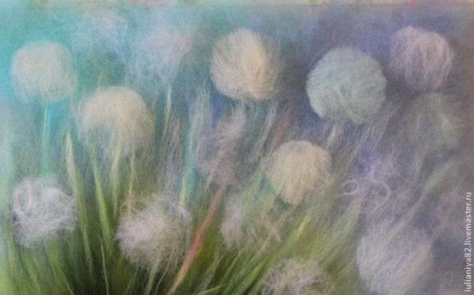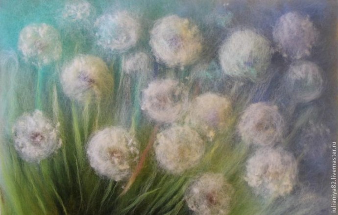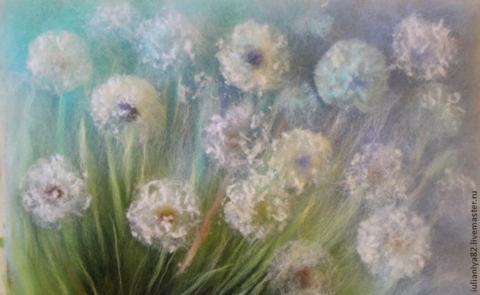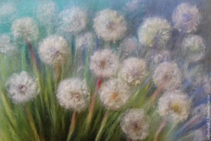 Этот мастер-класс я посвящаю прорисовке белых одуванчиков. Прорисовывать их можно разными способами, этот способ, который покажу я, не единственный и фантазия художников безгранична! Но для тех, кто только пробует что-то изобразить самостоятельно, используя волокна шерсти вместо красок, я думаю, эта информация принесёт пользу.