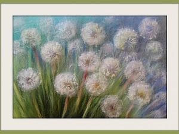 Очень быстро и натуралистично можно нарисовать небольшую картинку с одуванчиками и подарить кому-нибудь на праздник или украсить свой дом. Такие одуванчики можно сделать с детьми (от 6-7 лет), можно упростить фон и травы, например, сделать только фон и цветы на длинных стебельках.