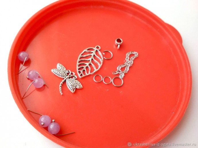 2. Начинаем с подвески — с весеннего настроения. В любую ёмкость с бортиками помещаем 5 бусин кварца, надетых на пины, две подвески, бейл, примерно 10 см тонкой цепочки, колечки