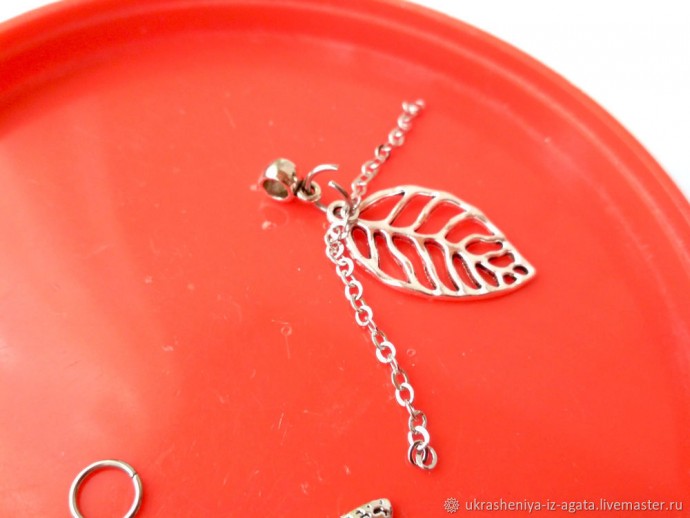 3. На разомкнутое кольцо надеваем листик, затем цепочку так, чтобы одна часть была длиннее другой.