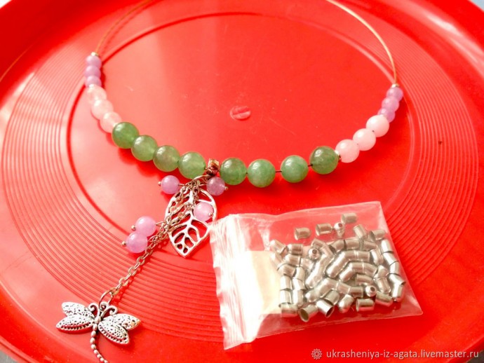 6. Собираем колье от центра. Сначала нанизываем подвеску, затем по 4 зелёных 10 мм, по 3 розовых кварца 8 мм, затем по 3 шт. фиолетового кварца 6 мм. Теперь нам потребуется резиновый шнур и так называемые концевики — металлические колпачки.