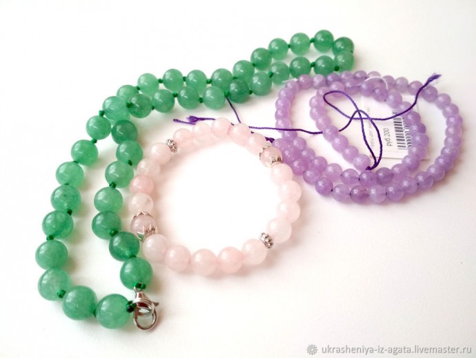 Как всегда, заглянем в коробку со старыми и надоевшими бусами и браслетами. Вот что я нашла: короткие зелёные бусы 10 мм на нити через узелок и браслет из розового кварца на резинке.