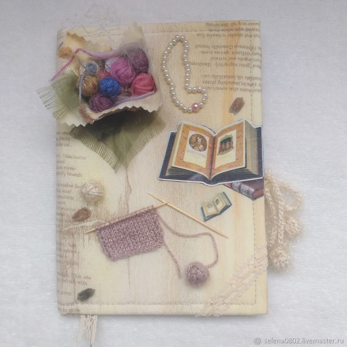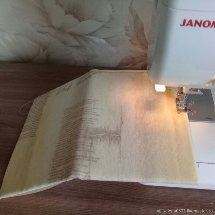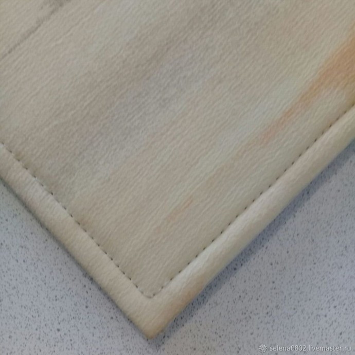 2. Накладываем обложку на ткань, отмечаем размеры, делаем припуски с каждого края по 2 см. Вырезаем, наносим на припуски клей, приклеиваем, оформляя уголки. Прокладываем отделочную строчку шириной 1 см по краю обложки. Вытягиваем нити на изнаночную сторону, завязываем, подклеиваем.